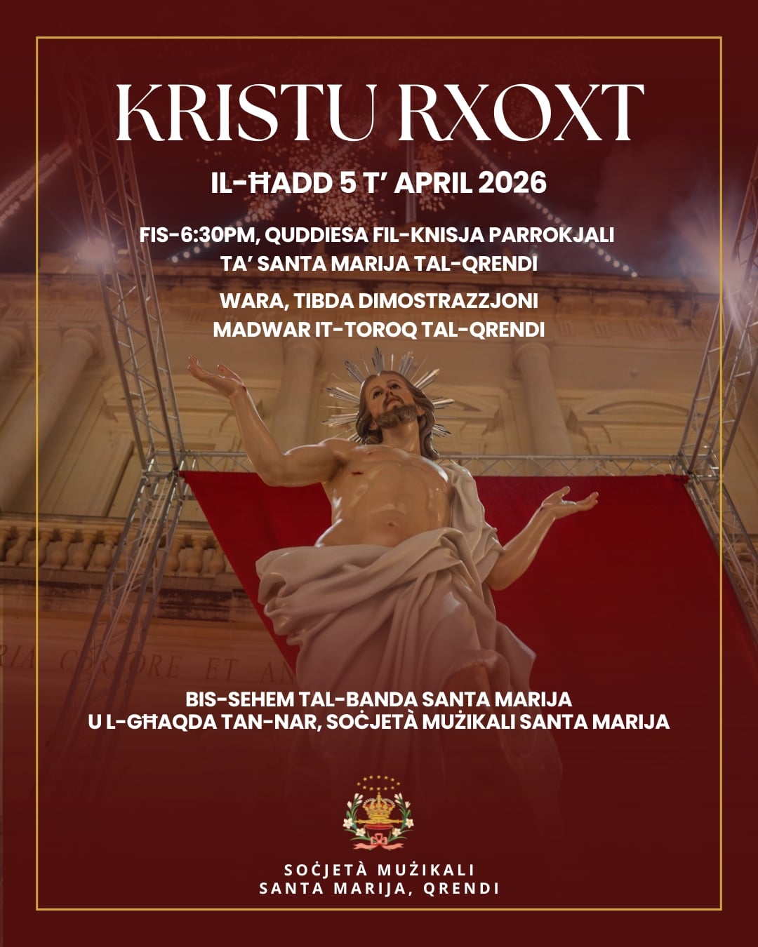 Merħba Fis-sit uffiċjali tas-Soċjetà Mużikali Santa Marija, Qrendi Isma Rajdu 15 ta' Awwissu L-Attivitajiet organizzati mis-Soċjetà Mużikali Santa Marija, Qrendi għal matul il-Festi tal-Għid